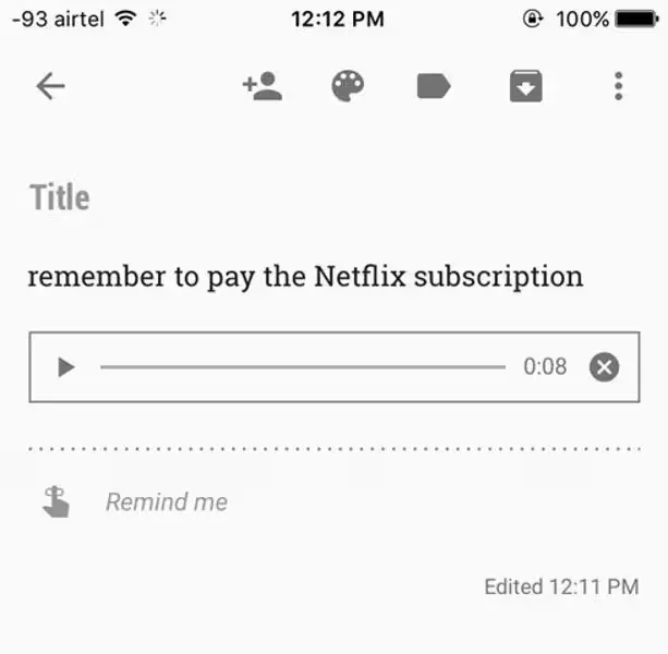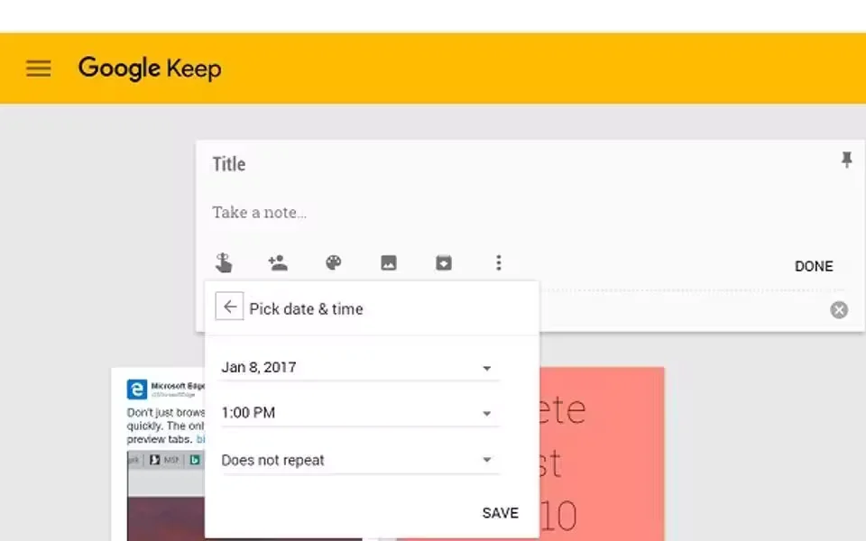 One of Keep’s most powerful features is its native integration with Google’s cross-platform reminder system. When you want to remember to look at a note at a particular time or place, just tap the little string-around-a-finger icon in the upper-right corner of the “note editing” screen.