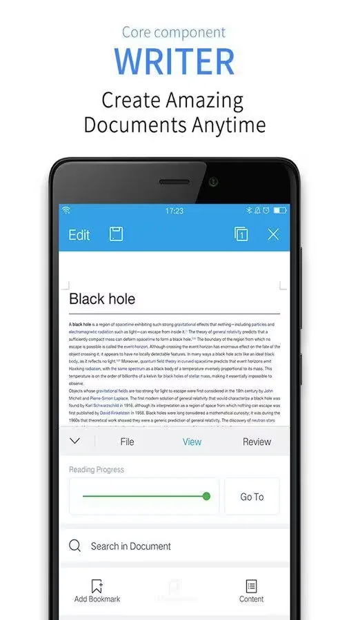 It sports a beautiful material design interface that adapts to your device’s screen size whether a phone or tablet and comes with Writer, Spreadsheets, and Presentation, each of which has excellent Microsoft Office compatibility (Word, Excel, and Powerpoint). WPS Office can be used to create simple documents, but it is also packed with advanced options to spruce up your documents such as tables, images, charts, and much more.