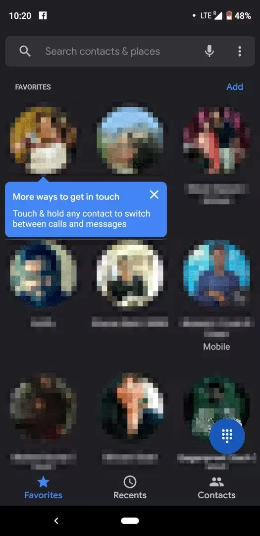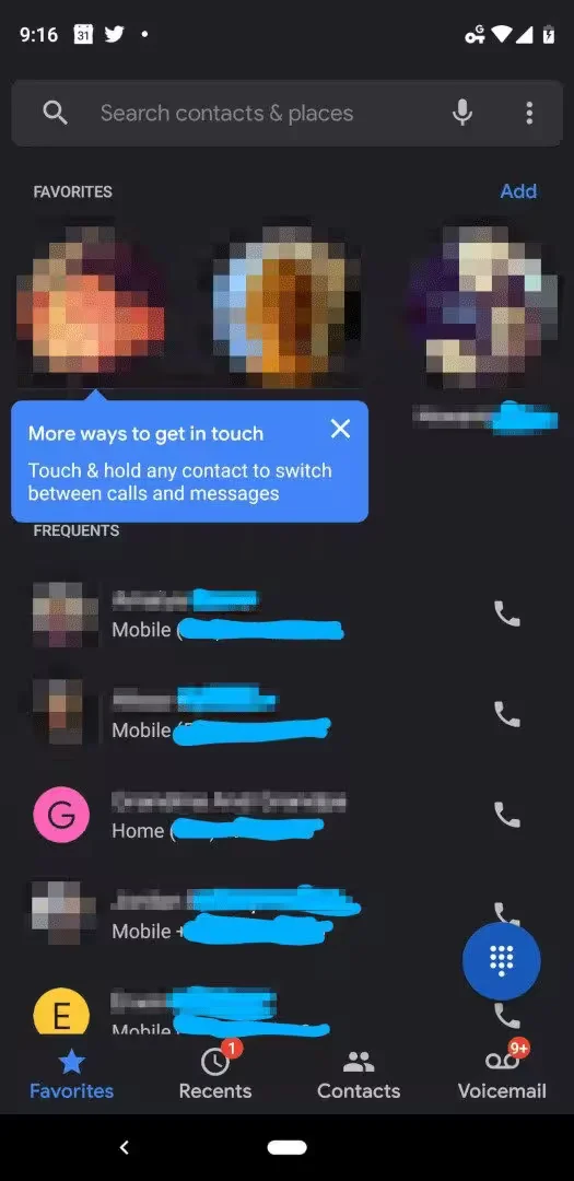 Once installed, the app will show a blue popup which explains the interface and how users can switch between calls and messages by performing a long-press on the contact icon. The UI is also updated to have a dark mode. Scrolling past the Favorites will reveal a list of frequently-contacted numbers that Google thinks you might want handy as well.