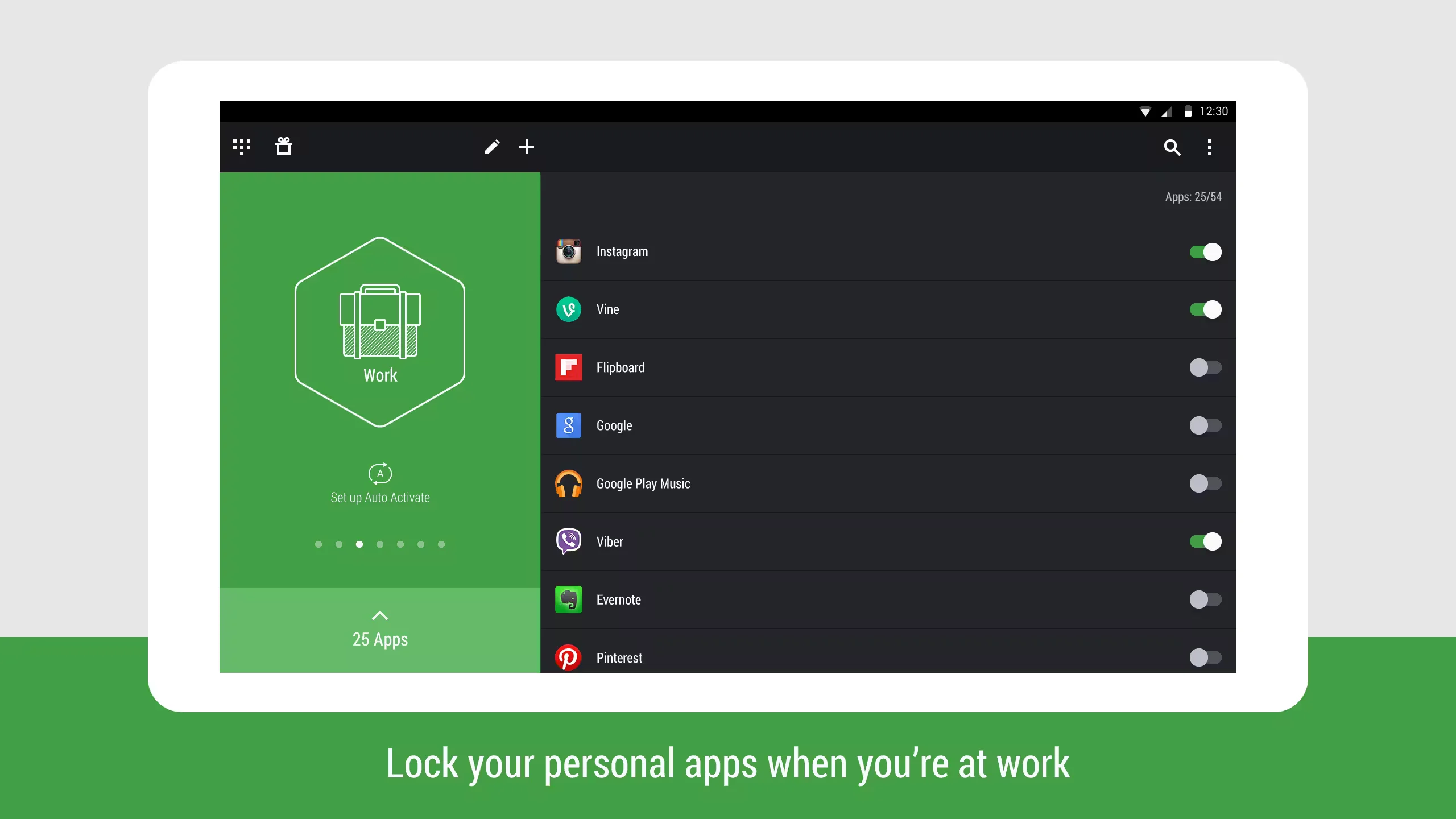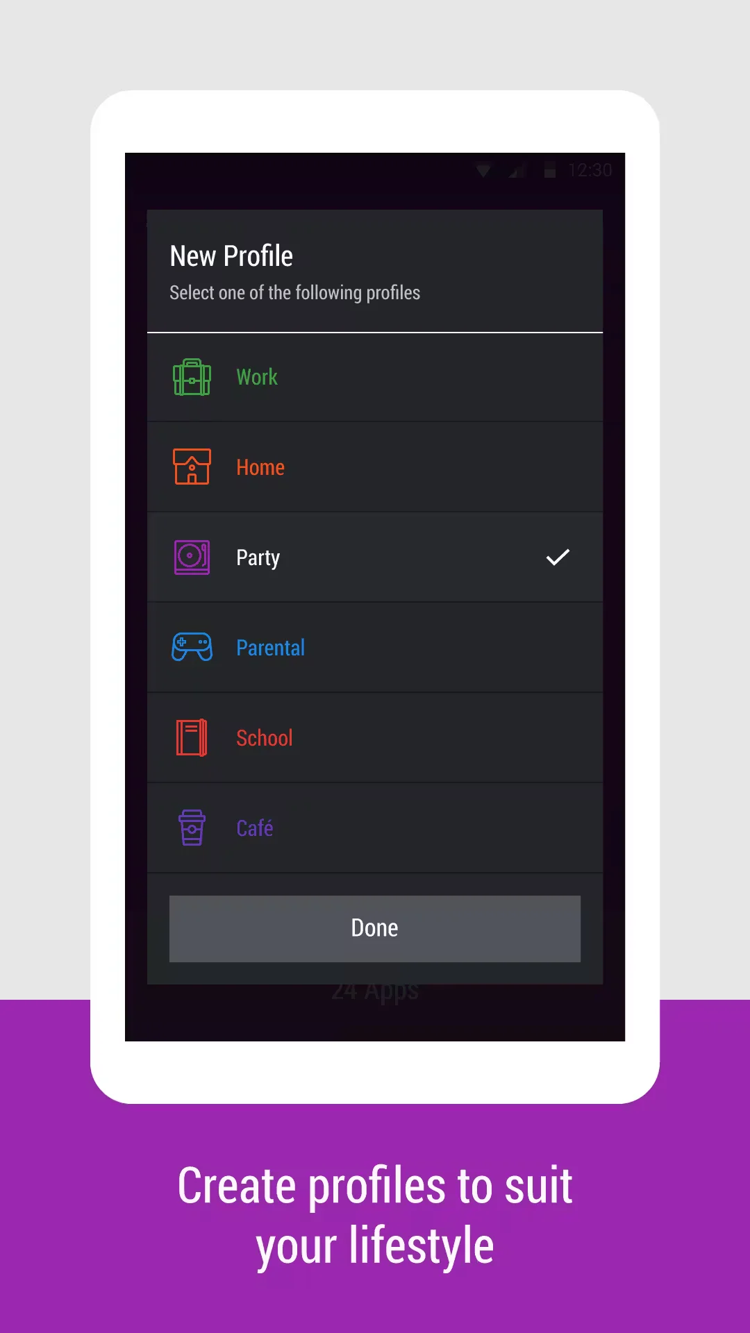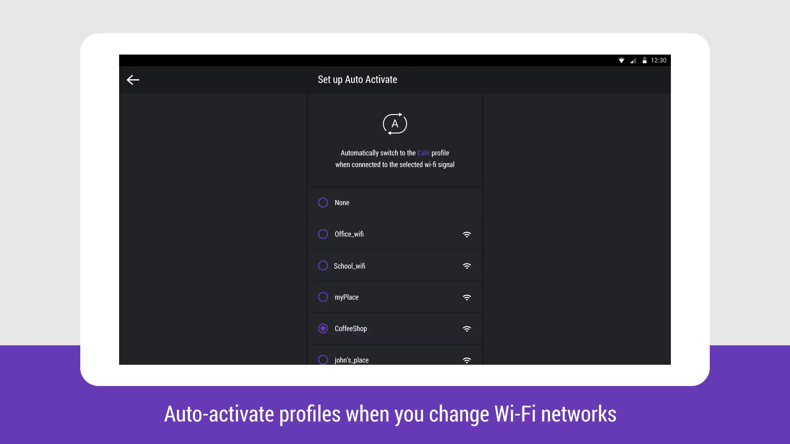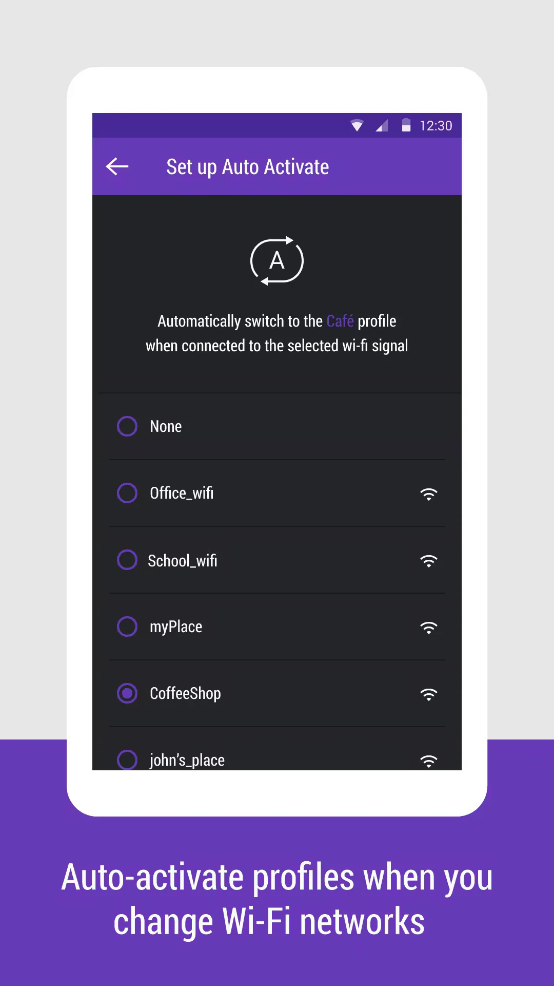 In addition to manually activating profiles, you can also enable the profiles to switch automatically based on the Wi-Fi network your device is connected. However, the app lacks the ability to auto enable profile based on GPS location.