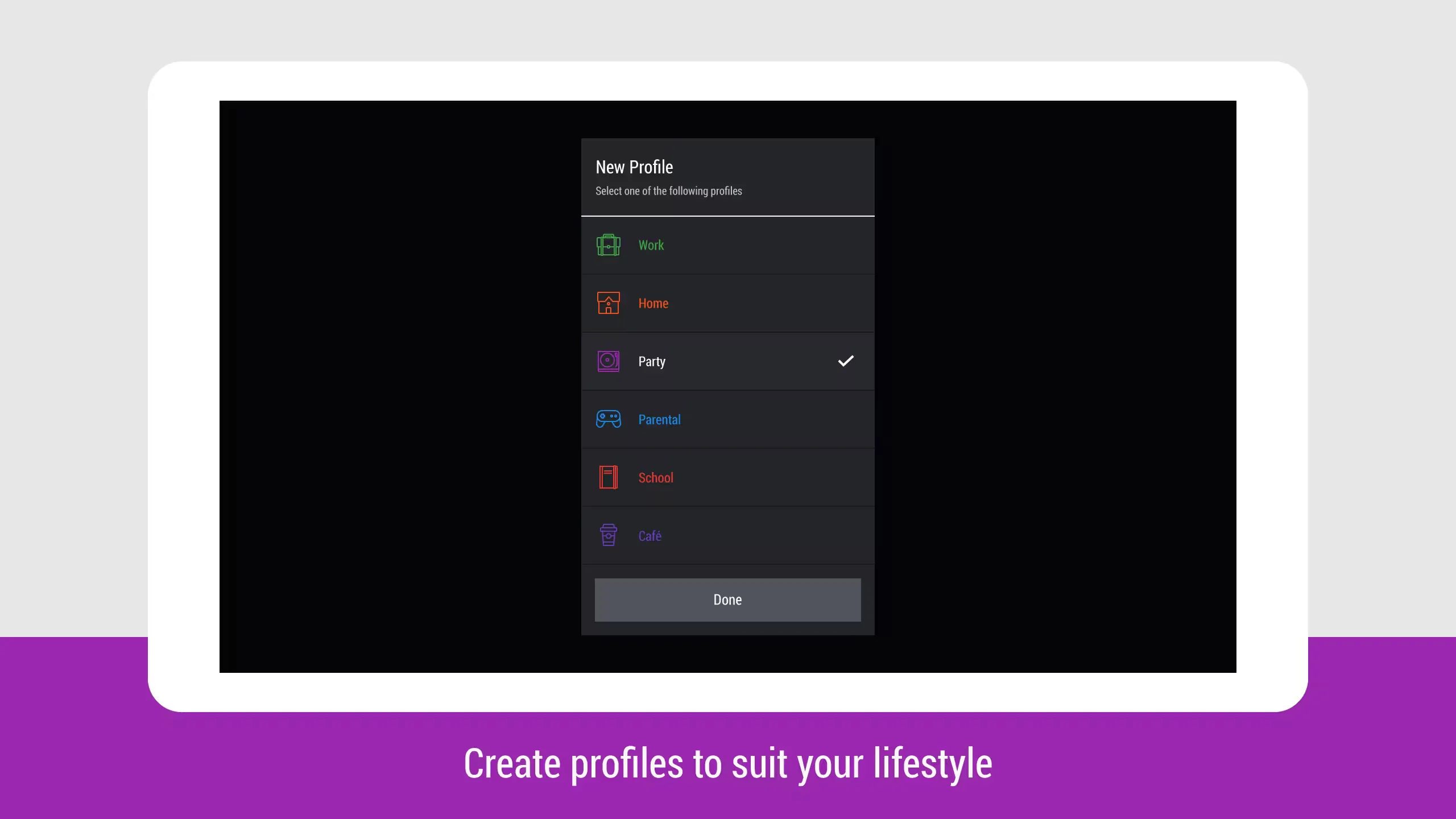 - Auto enables profile based on Wi-Fi