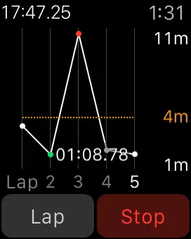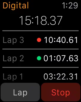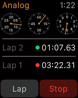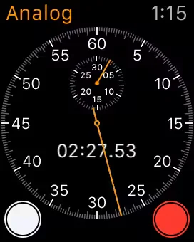 Pressing the green circle in the corner will start the stopwatch. (Note the green circle will be in a different place depending on which hand you wear the Apple Watch as well which side the Digital Crown is on). The red circle stops the stopwatch and pressing the green circle resumes it. Pressing the white circle starts a lap. In the Analog view, swiping up from the bottom of the display gives a detailed view of the information, showing the breakdown of the laps.