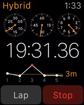The Stopwatch app supports different views. Switching between the different views requires you to press firmly on the screen for about a second until you feel the haptic feedback. Force Touching the display presents an additional three different views for the Stopwatch: Digital, Graph and Hybrid. Digital displays the stopwatch in a numerical view. Graph conveys how long each lap took on a graph. The last view, Hybrid combines the three different views Analog, Digital and Graph into one stopwatch.
