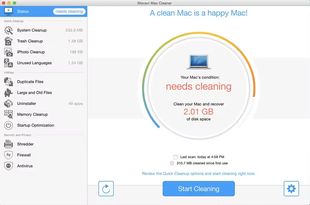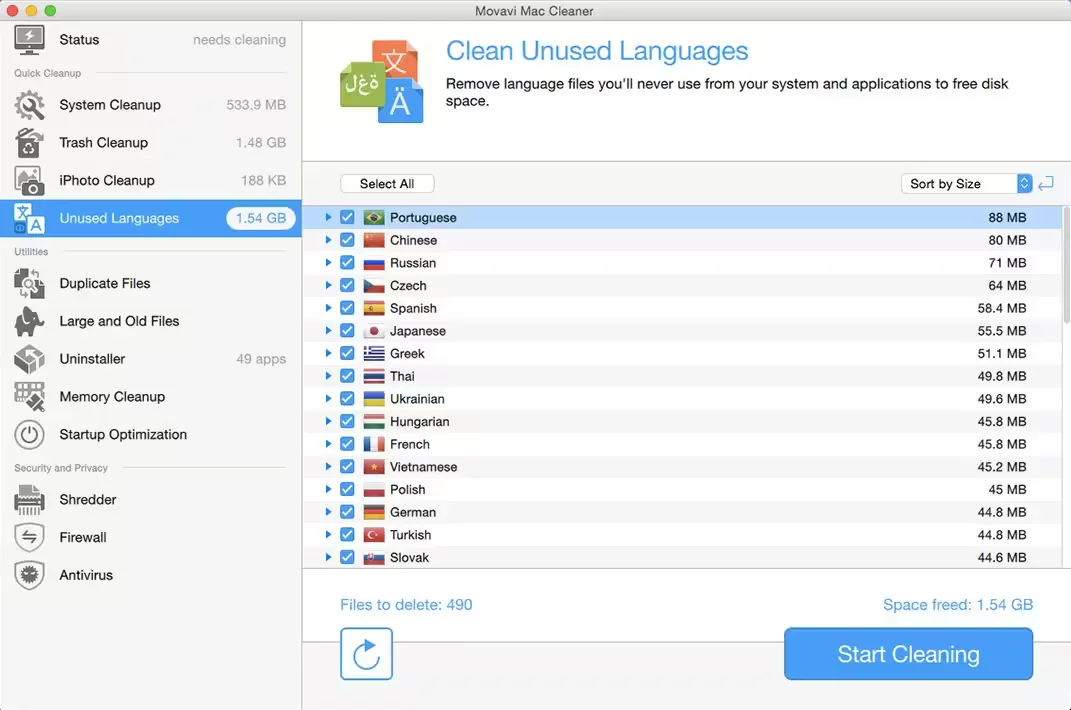 At the heart of Movavi Mac Cleaner is its ability to clean out all sorts of junk files, regardless of where they are located. Whenever you launch the app, it will immediately initiate a scan of your hard drive and as soon as it is done give you the option to remove all the junk that was found by clicking on the “Start Cleaning” button. In some cases you may want to determine which types of files you delete, in which case you can opt to only delete logs, cache files, trash bins, duplicates, and so on accordingly.