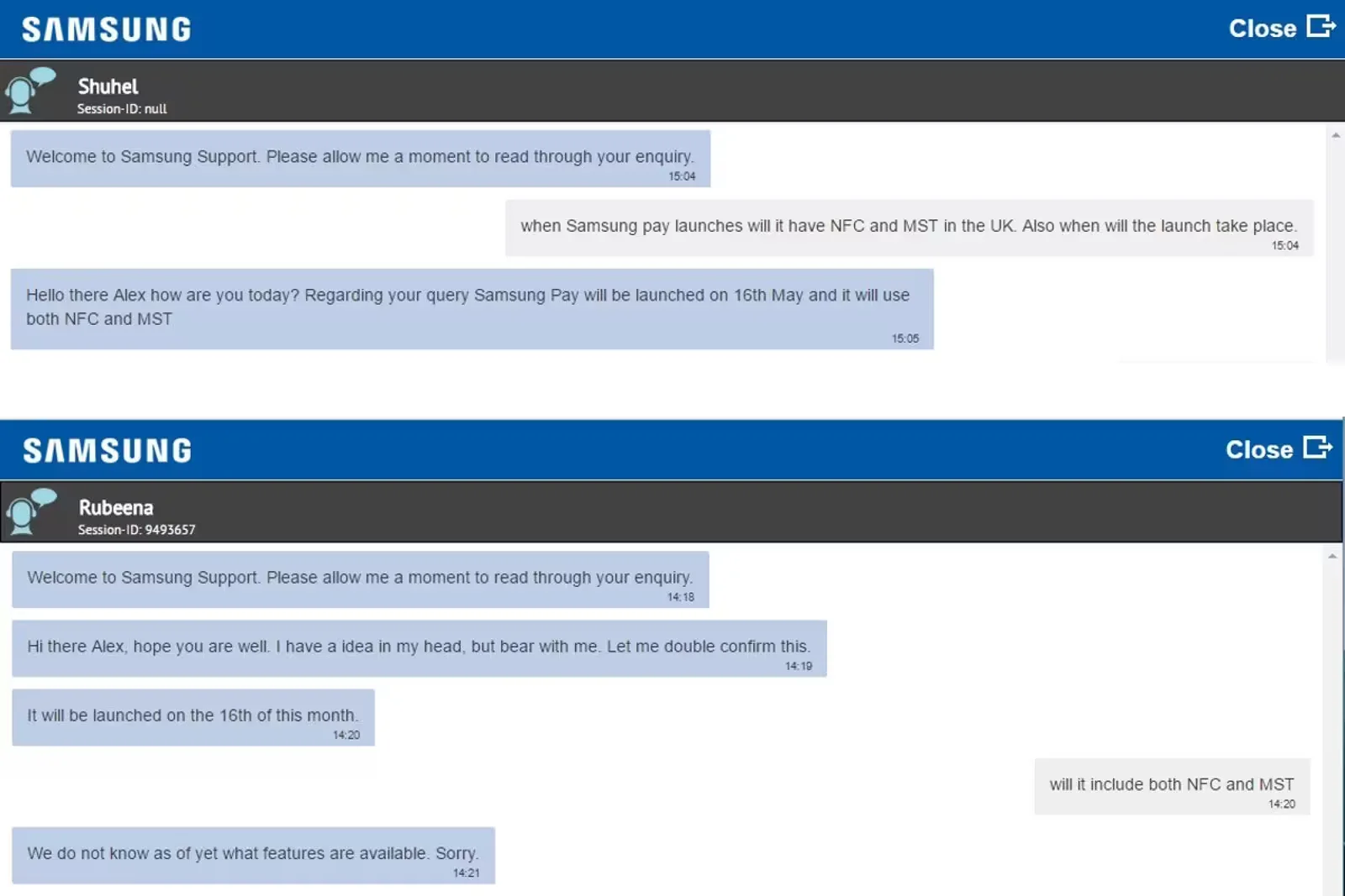SamMobile shows records of chat with Samsung representatives as a solid proof for the launch date of Samsung Pay in UK. In addition, a product page over on Samsung’s website confirms Samsung Pay will launch in the UK in the not-too-distant future, though it does not mention the alleged May 16 release date.
