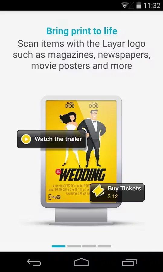 Layar allows users to view embedded digital content within a variety of sources, such as posters, magazine pages, advertisements, and product QR codes. These can lead to a variety of extra content, such as movie trailers, product discount codes, linked videos, websites or alternate versions of a page or poster.